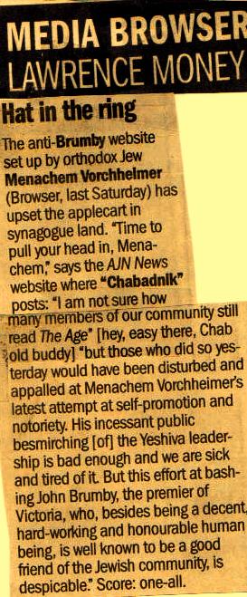 Seeing that many in our community no longer subscribe to the Age, and after having recently criticised Menachem's blog effort, we feel it is only fair to post this article to show what the upset is all about.