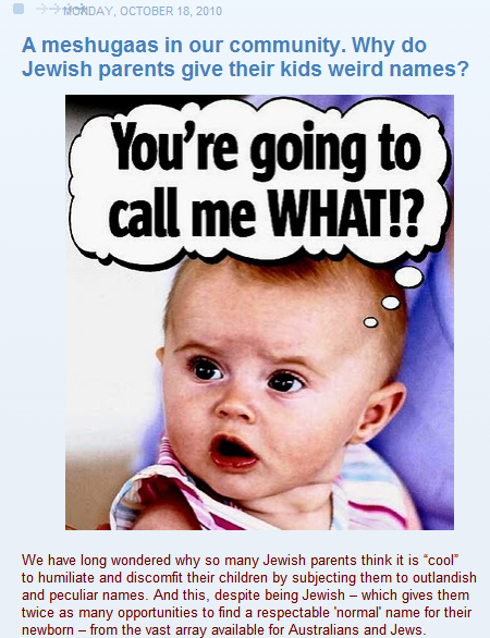 While we'd like to claim that the following article in the AJN this week was inspired by our 'classic' post 2 years ago, we can't. After all, the AJN has been listing names by popularity for years. However, while we see that the craze of lumbering kids with outlandish and strange (and often embarrassing tags hasn't diminished, it was nice to see a few good old traditional Jewish names (mainly for boys, mind you) on the list.Thursday, December 22, 2011